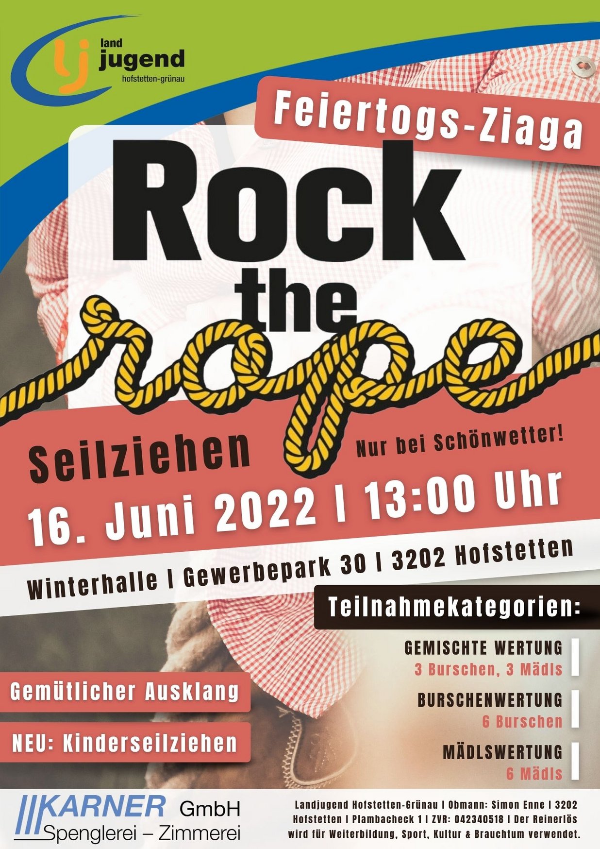 Unter diesem Motto veranstalten wir, die Landjugend Hofstetten-Grünau, zu Fronleichnam am 16. Juni 2022 unseren Seilziehwettbewerb mit dem Namen "ROCK THE ROPE - Feiertogs-Ziaga" bei der Wiese gegenüber der Winterhalle (Gewerbepark 30, 3202 Hofstetten-Grünau).
