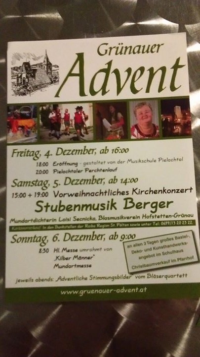 Nach einem erfolgreichem Theater findet schon das nächste Event statt. Sei auch du am Grünauer Advent von 4. bis 6. Dezember 2016 dabei und besuche uns am Satnd der Lj Hofstetten-Grünau! Genieß nicht nur Tee mit Schnaps, sondern auch Tee mit Cherry, ABAC und Speckstangerl. Achtung! Heuer findet das erste Mal am Freitag um 20:00 ein Pielachtaler Perchtenlauf statt. Auf euer Kommen freut sich die Landjugend Hofstetten :)