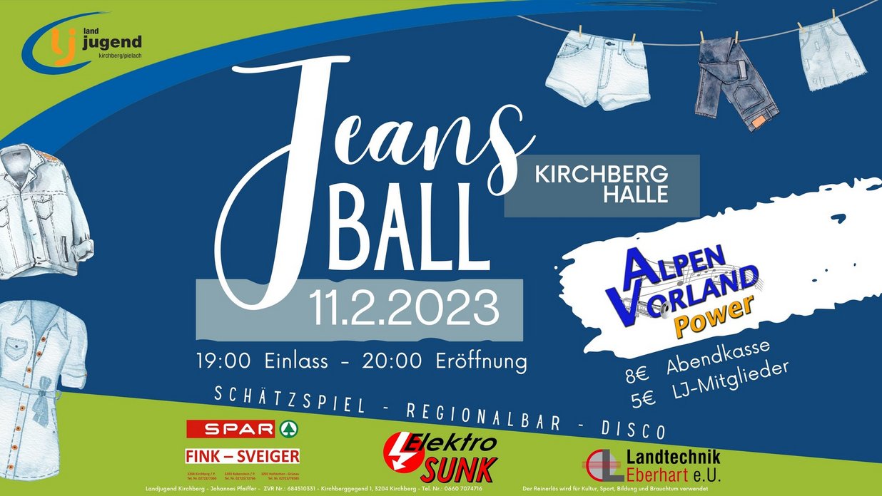 Am 11.02.2023 ist es endlich wieder soweit und die Landjugend Kirchberg lädt wieder zum Jeansball ein. Eigentlich ein ganz normaler Ball, nur dass ihr hierfür keine eigene Ballkleidung benötigt, sondern mit euren Jeansklamotten vorbei schaun dürft. Ob Hose, Kleid, Jacke oder sonstige Kleidungsstücke aus Jeansstoff sind erwünscht.
