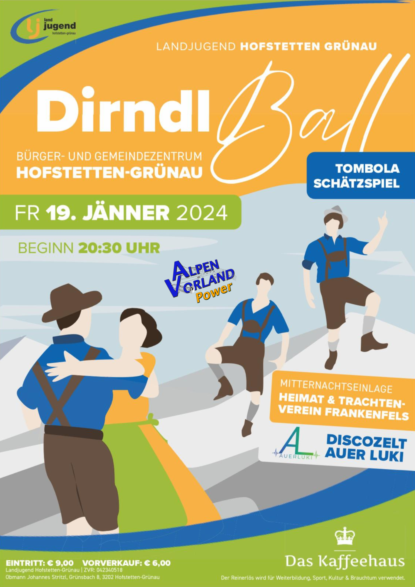 Am Freitag, den 19. Jänner 2024 ab 20.30 Uhr laden wir zum alljährlichen Dirndlball ins Bürger- und Gemeindezentrum Hofstetten ein. Während zur Musik der Gruppe „AlpenVorlandPower“ bis in die Morgenstunden das Tanzbein geschwungen werden kann, sorgt im Discozelt „AUER LUKI“ für gute Stimmung. Tombola, Schätzspiel und eine grandiose Mitternachtseinlage des „Heimat & Trachtenvereins Frankenfels“ runden den Ballabend traditionell ab.