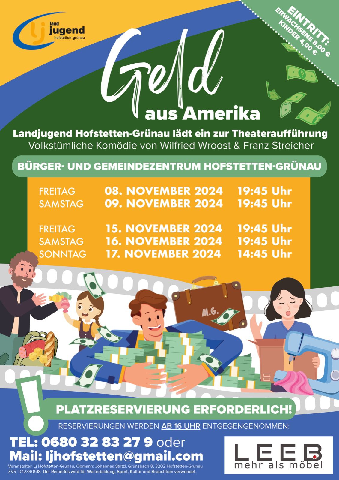 Hinweis: Eine Sitzplatzreservierung ist erforderlich. Reservierungen sind ab 16 Uhr telefonisch unter 0680/3283279 oder per E-Mail an ljhofstetten@gmail.com möglich. Der Eintrittspreis beträgt 8 Euro für Erwachsene und 4 Euro für Kinder. Der Reinerlös wird für Weiterbildung, Sport, Kultur und Brauchtum verwendet.